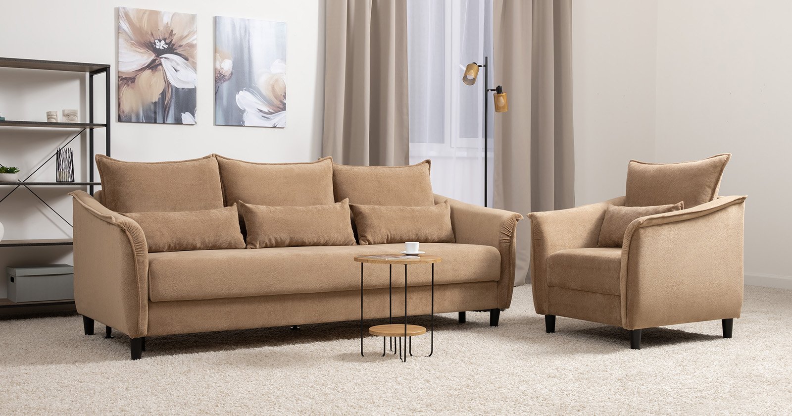 Изогнутые подлокотники в форме лепестков придают коллекции изысканный и элегантный вид, а дополнительные декоративные подушки обеспечат поддержку тела и помогут уютно устроиться на диване. В наполнении дивана используется высокоэластичная пена, которая адаптируется к форме вашего тела и гаранитует максимальный комфорт во время отдыха.