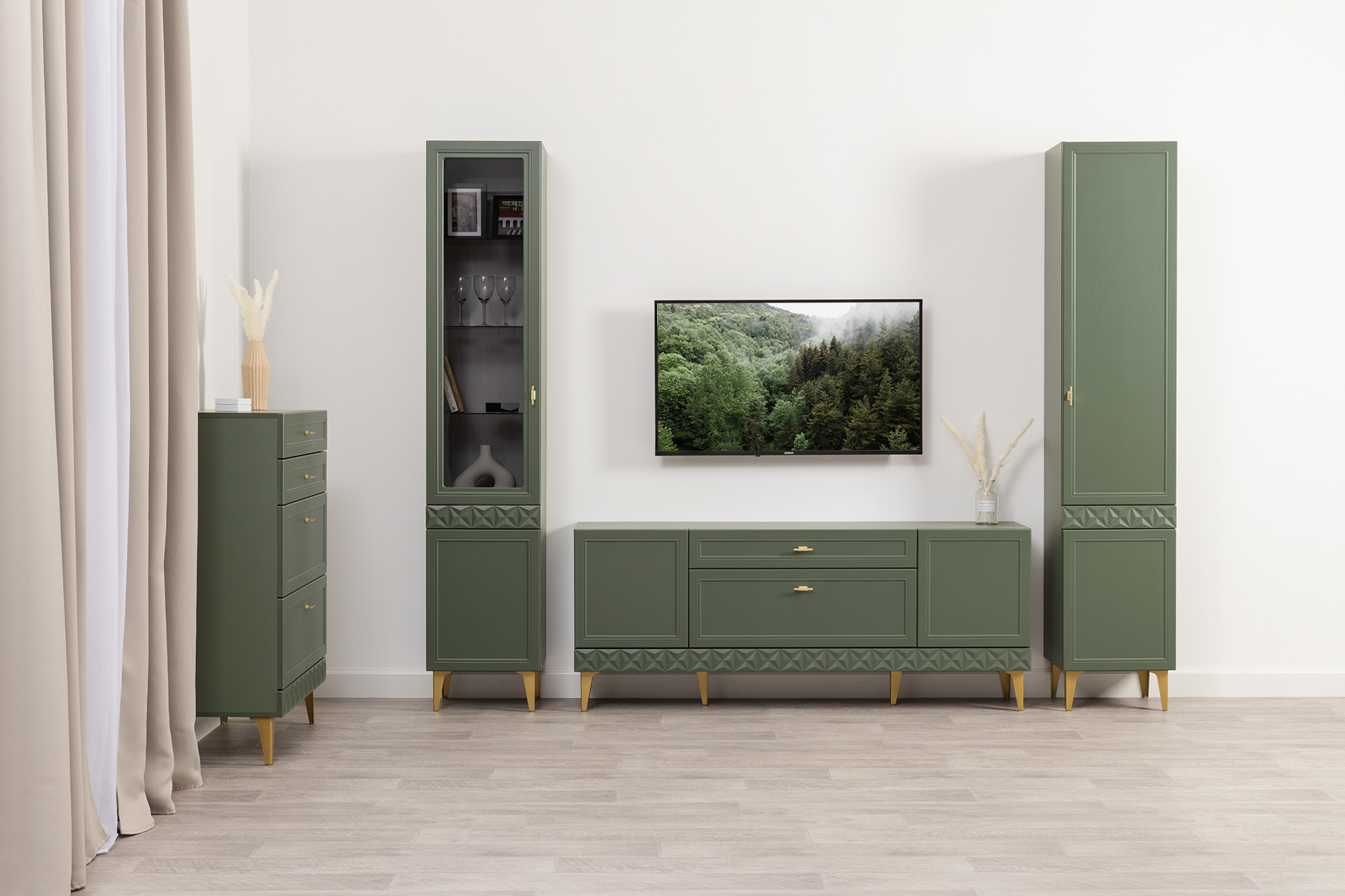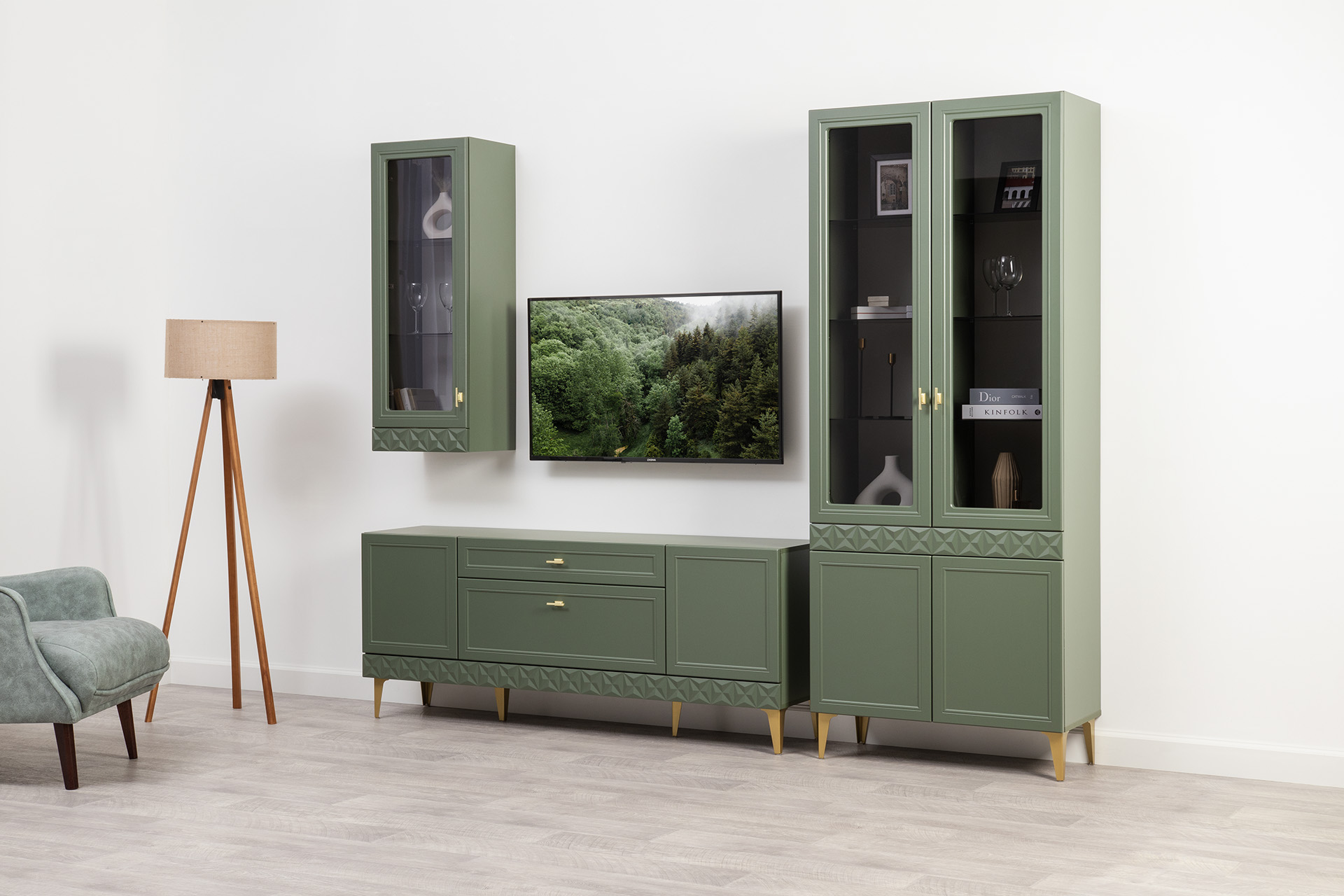 Гостиная Марион композиция 1 дымчатый зеленый K521, олива шагрень AG 1050 ПВХ, белый PE шагрень (собирается на любую сторону)