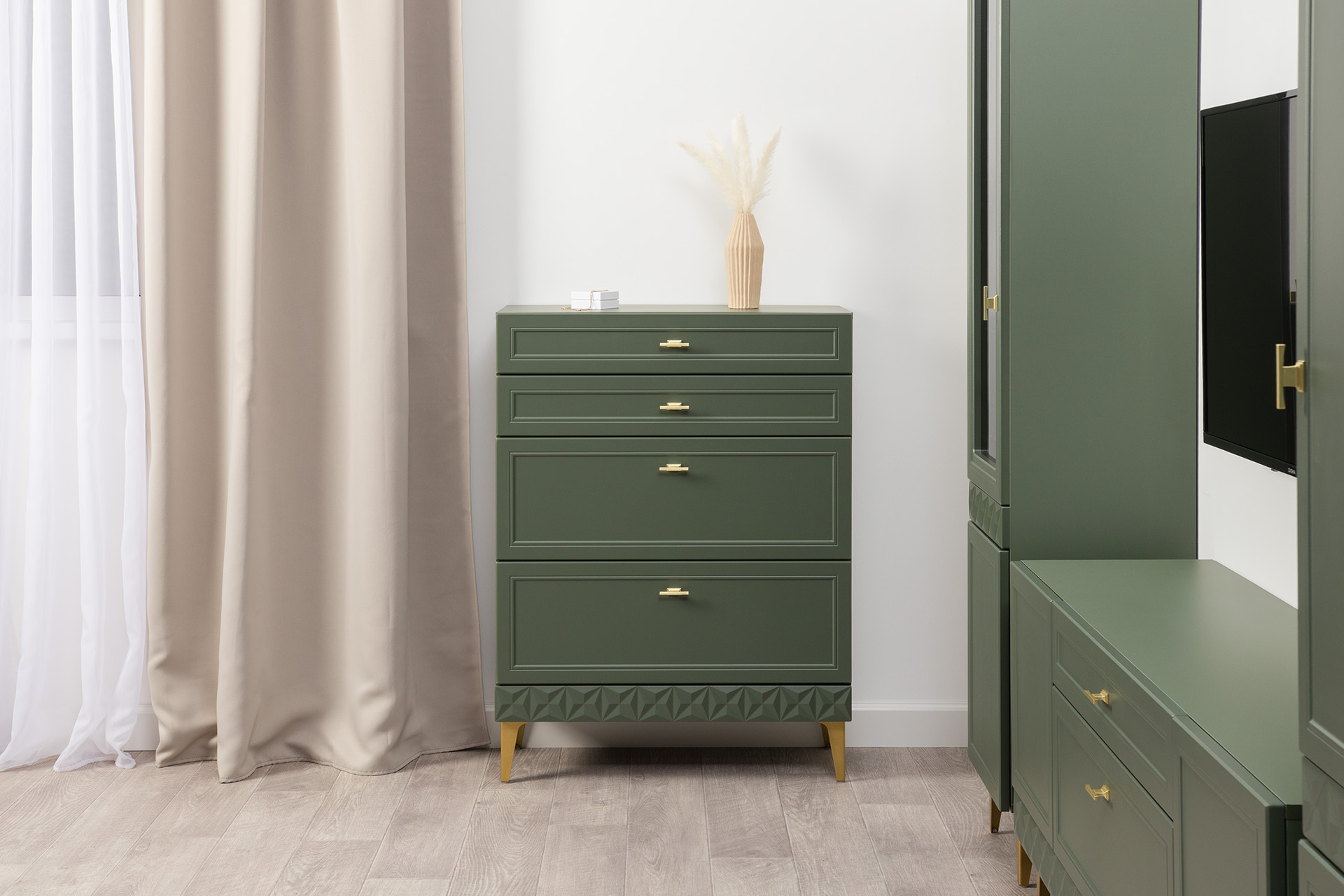 Комод Марион 16.249 дымчатый зеленый K521, олива шагрень AG 1050 ПВХ, белый PE шагрень