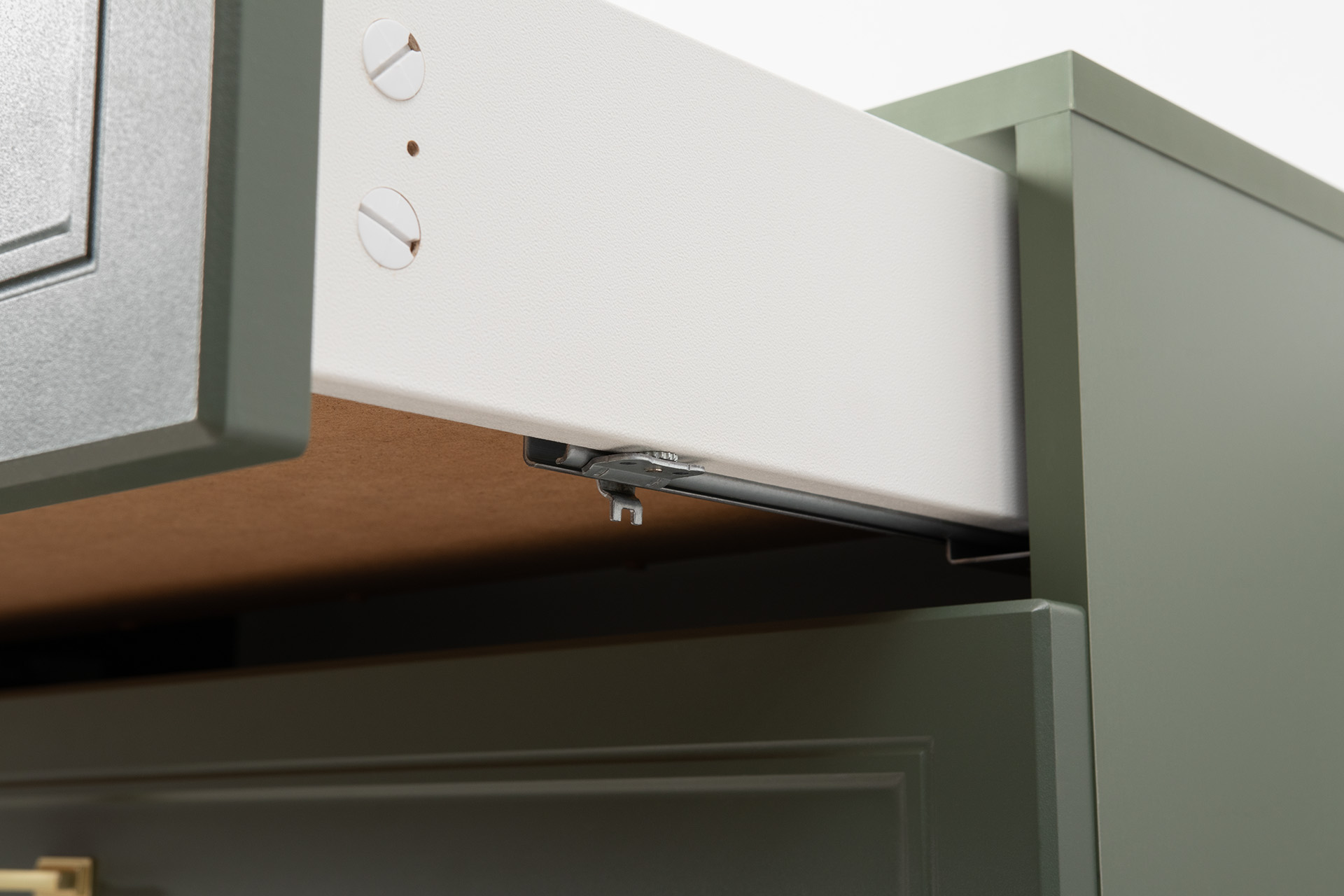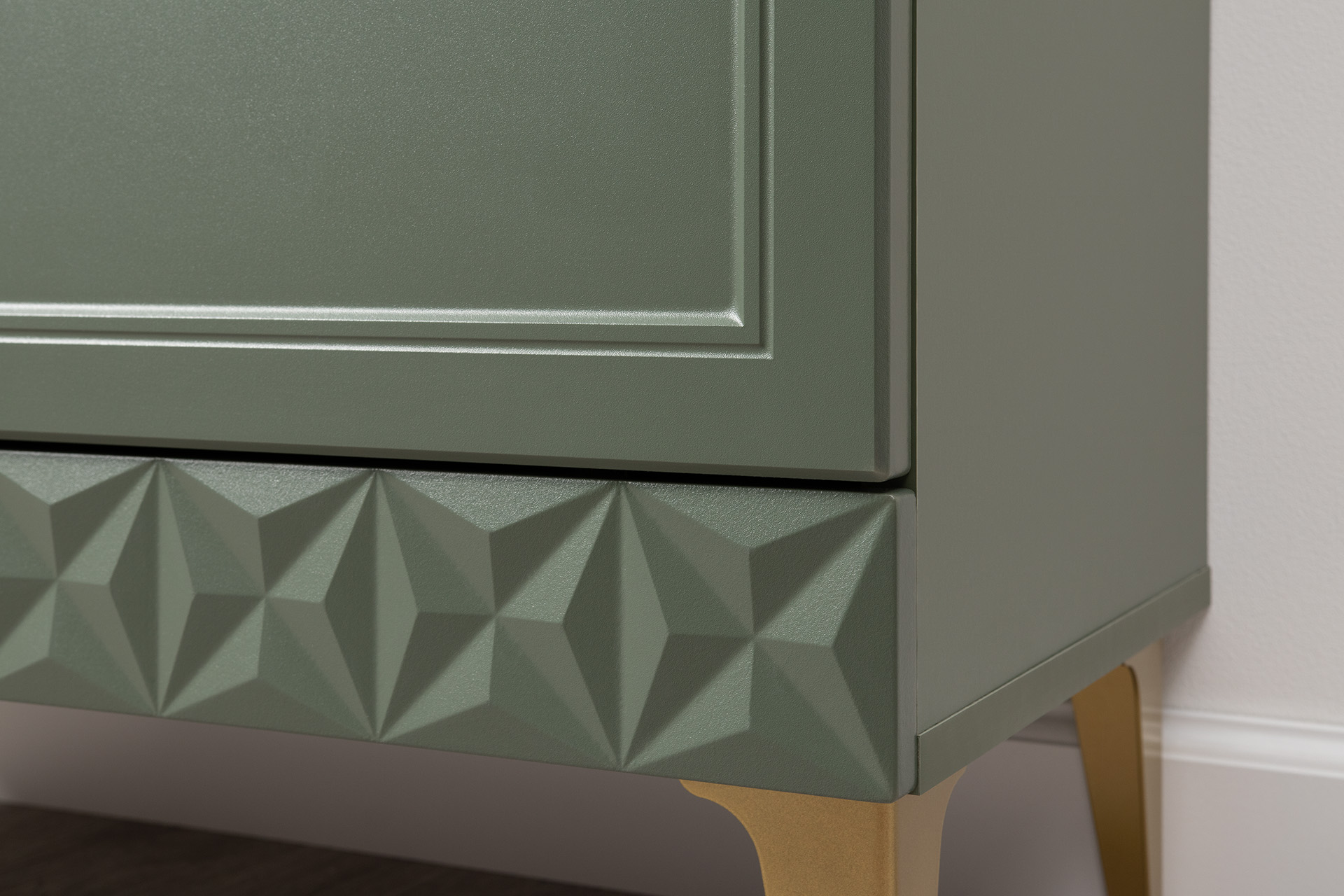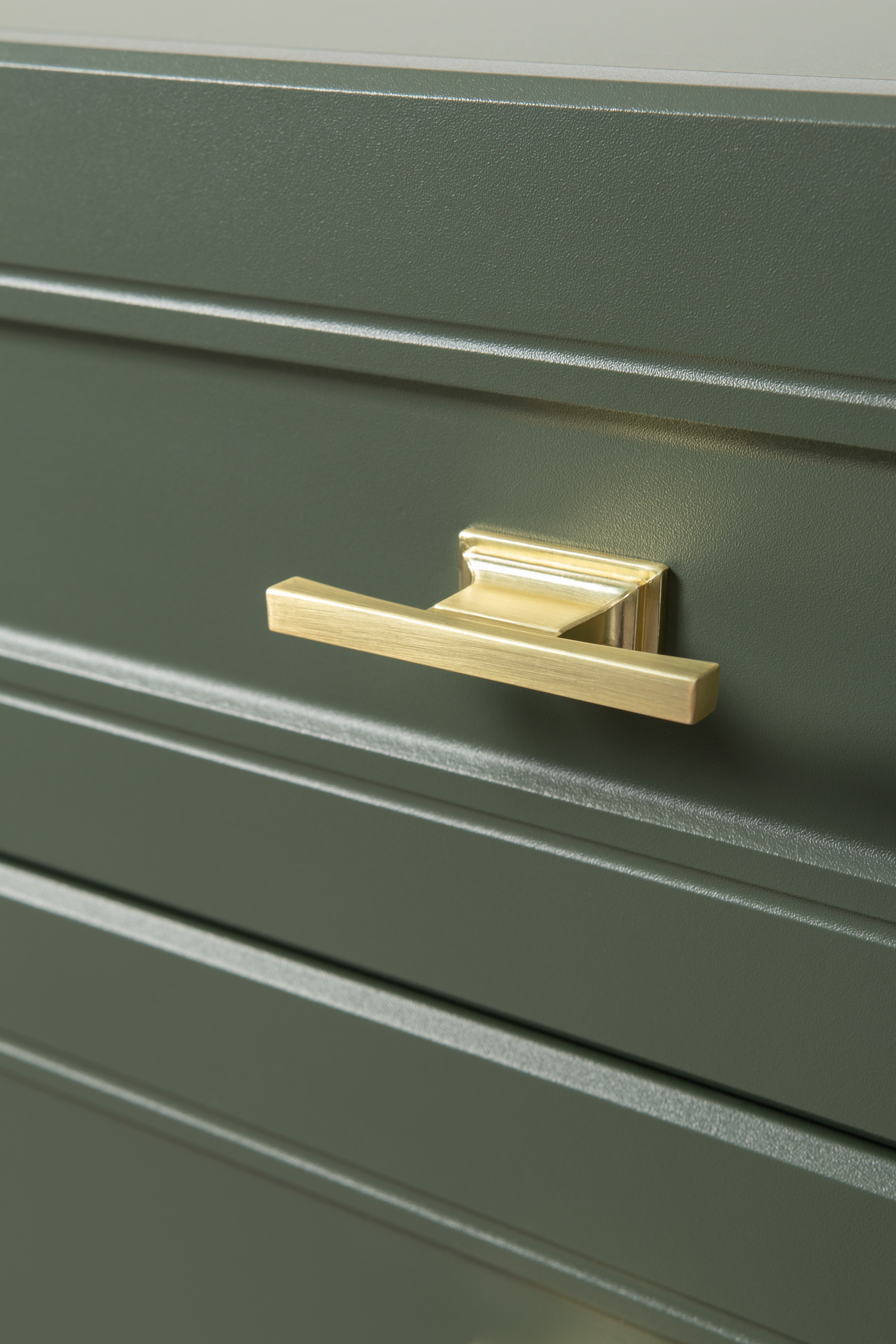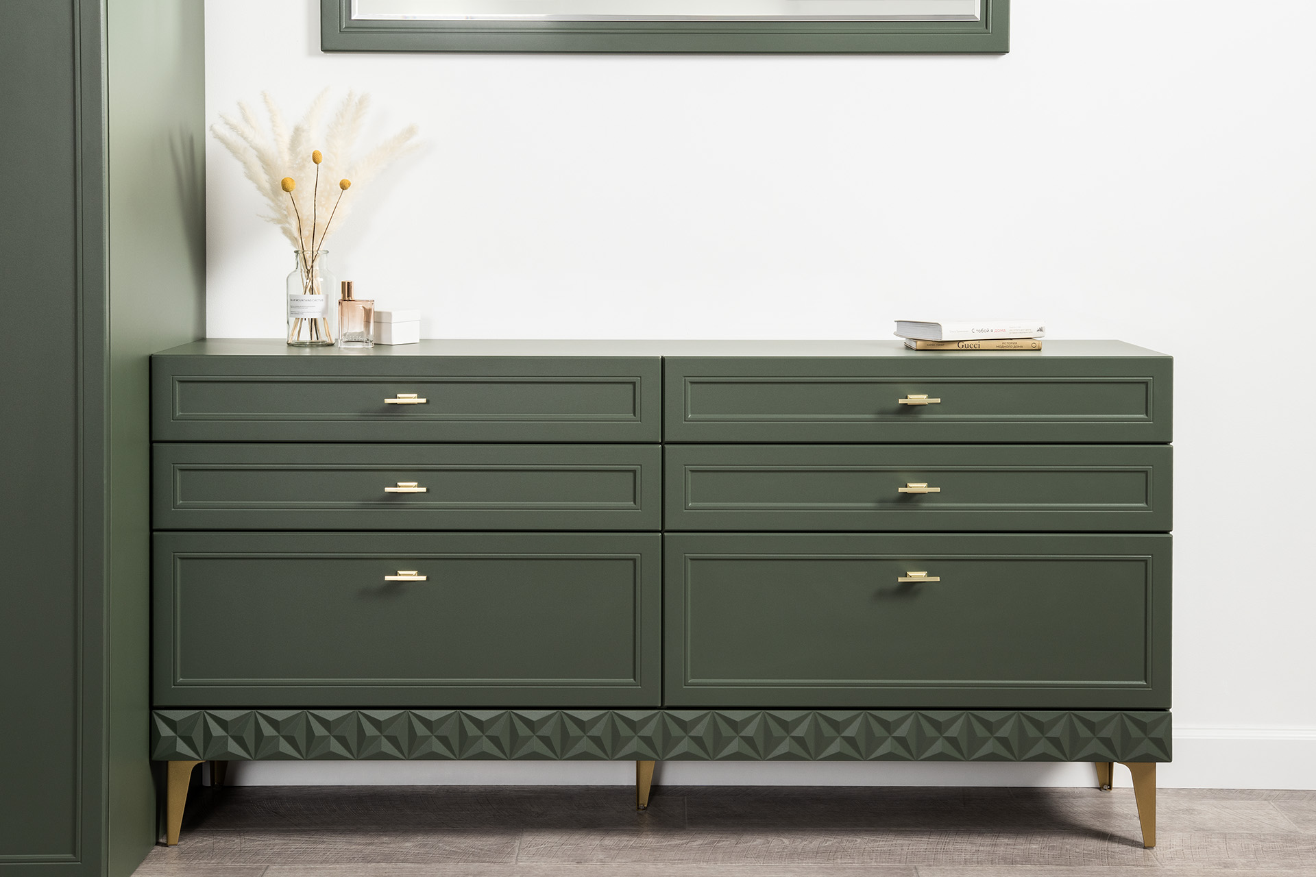 Изящные линии, глубокая фрезеровка фасадов из МДФ и благородные оттенки. Утончённая «Слоновая кость» и изысканная «Олива Шагрень» с глубоким зелёным тоном — создают атмосферу уюта, тепла и благородства. Металлические ручки и опоры золотого цвета придают мебели утончённый блеск, а петли и направляющие с доводчиками обеспечивают плавное и бесшумное закрытие фасадов.