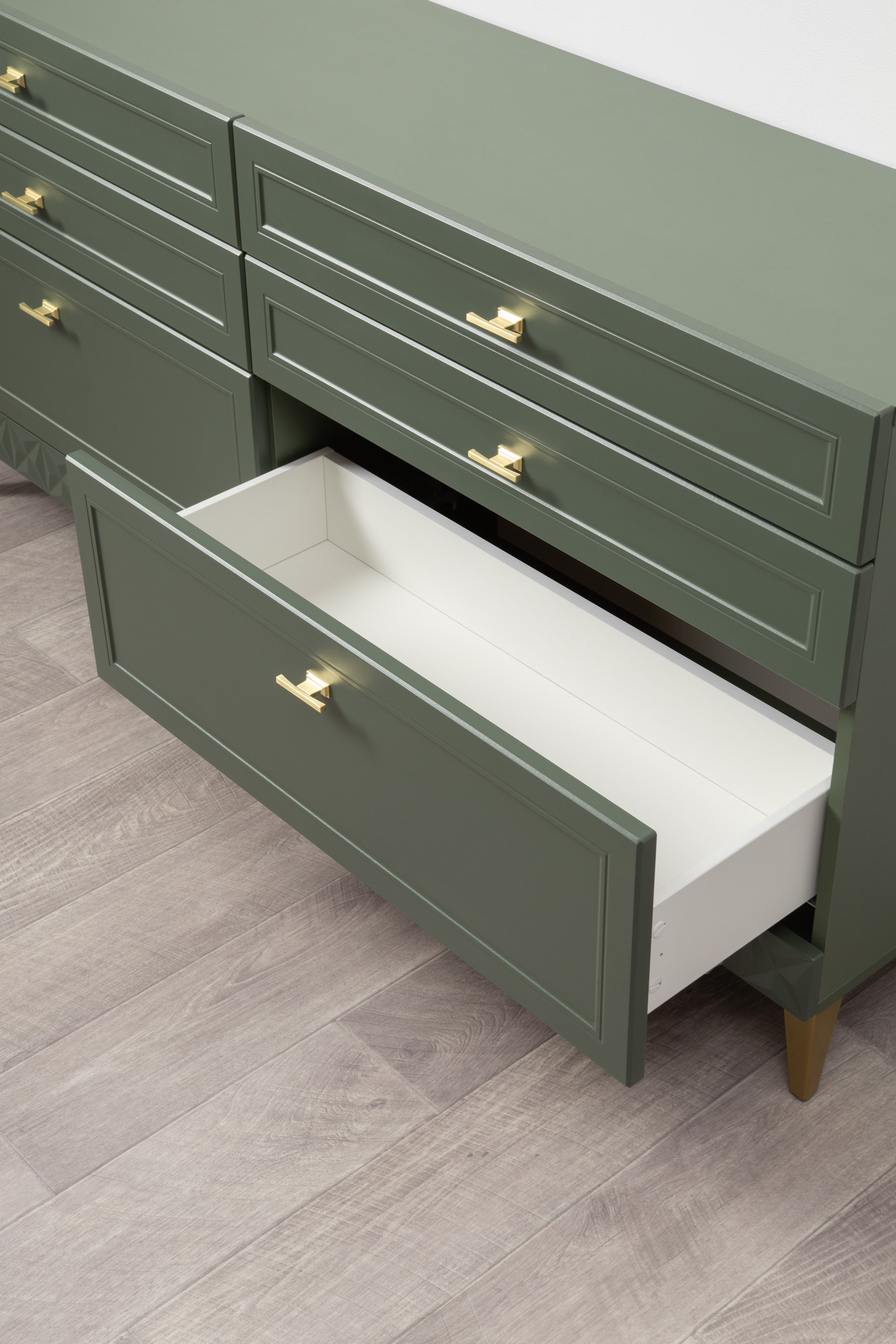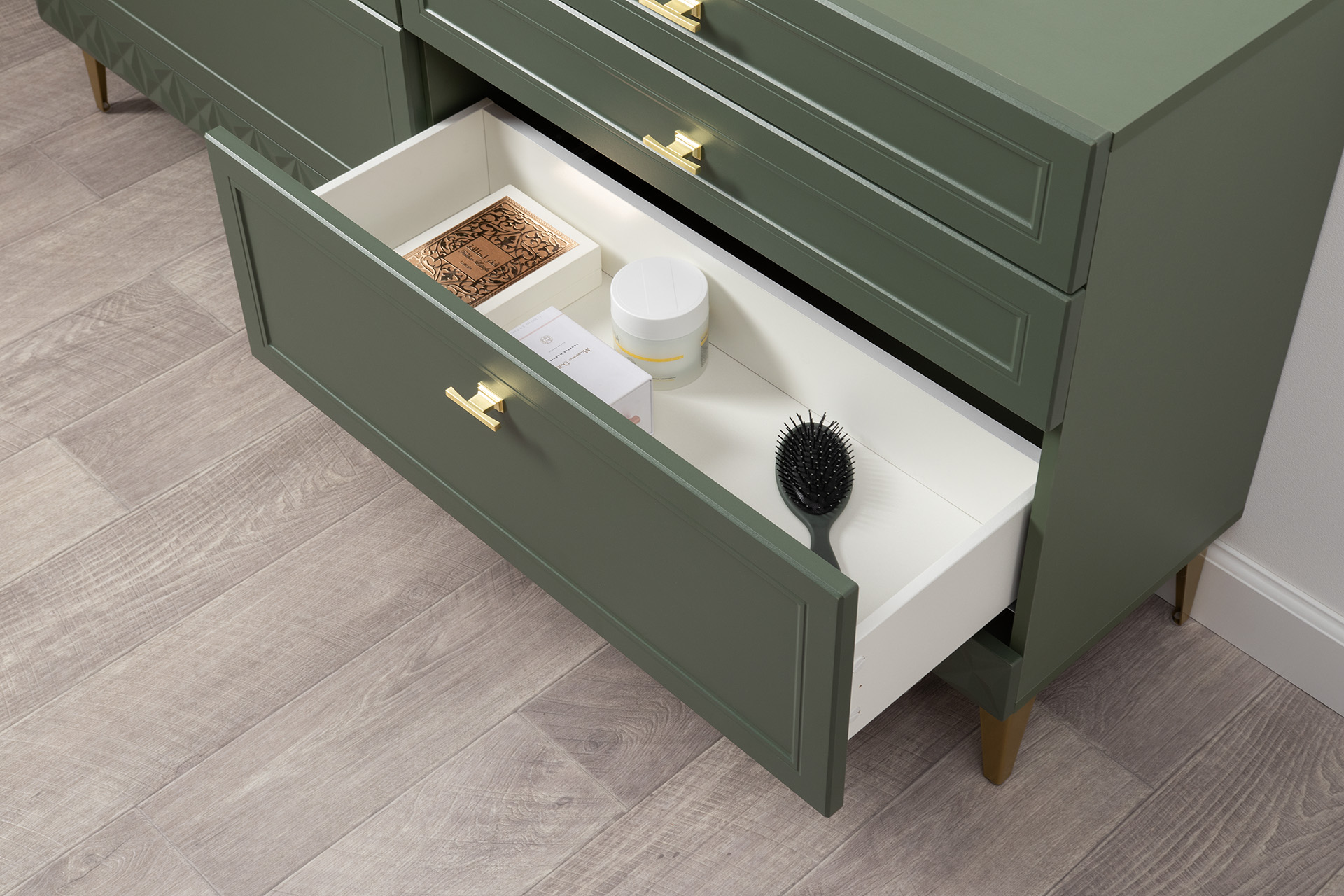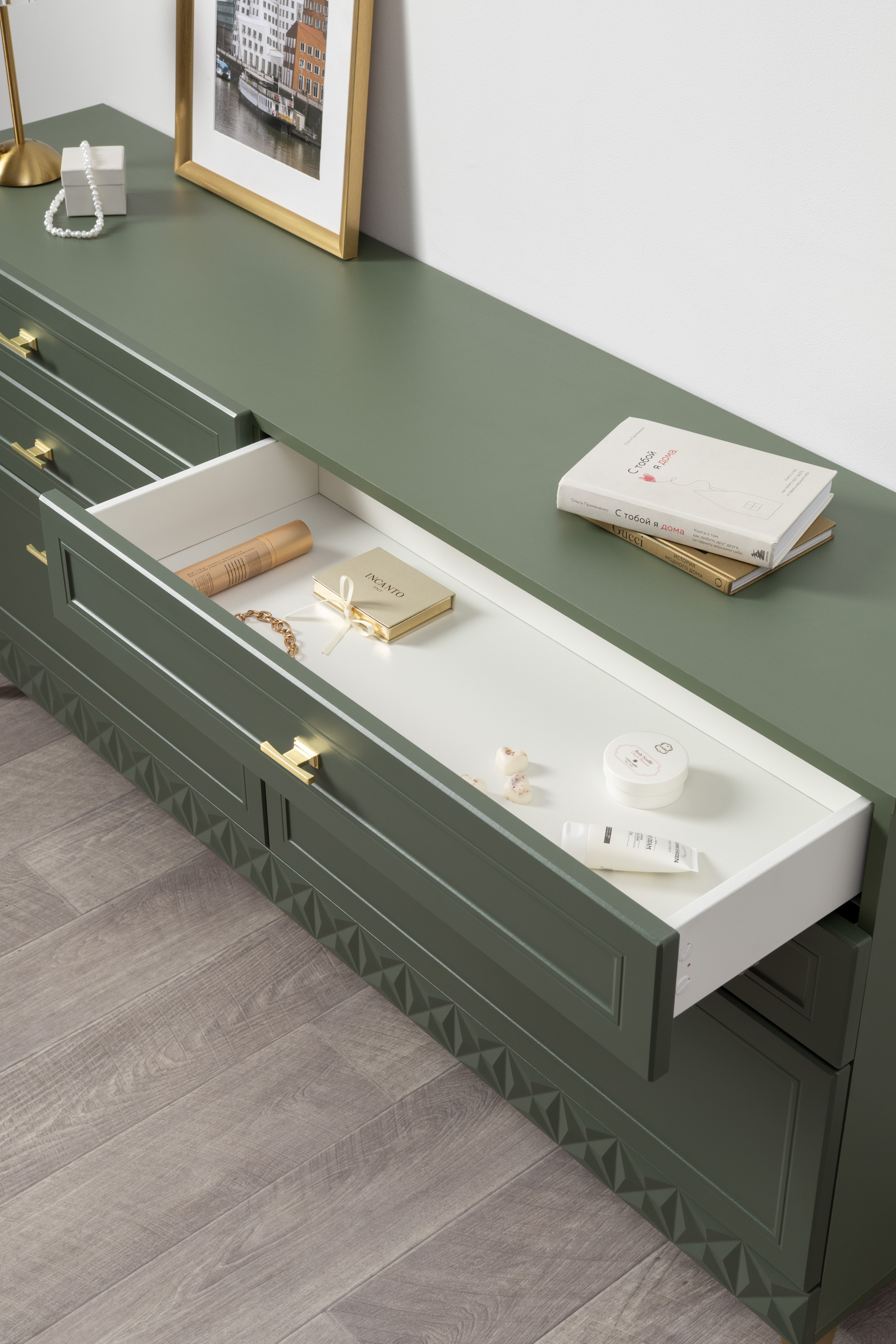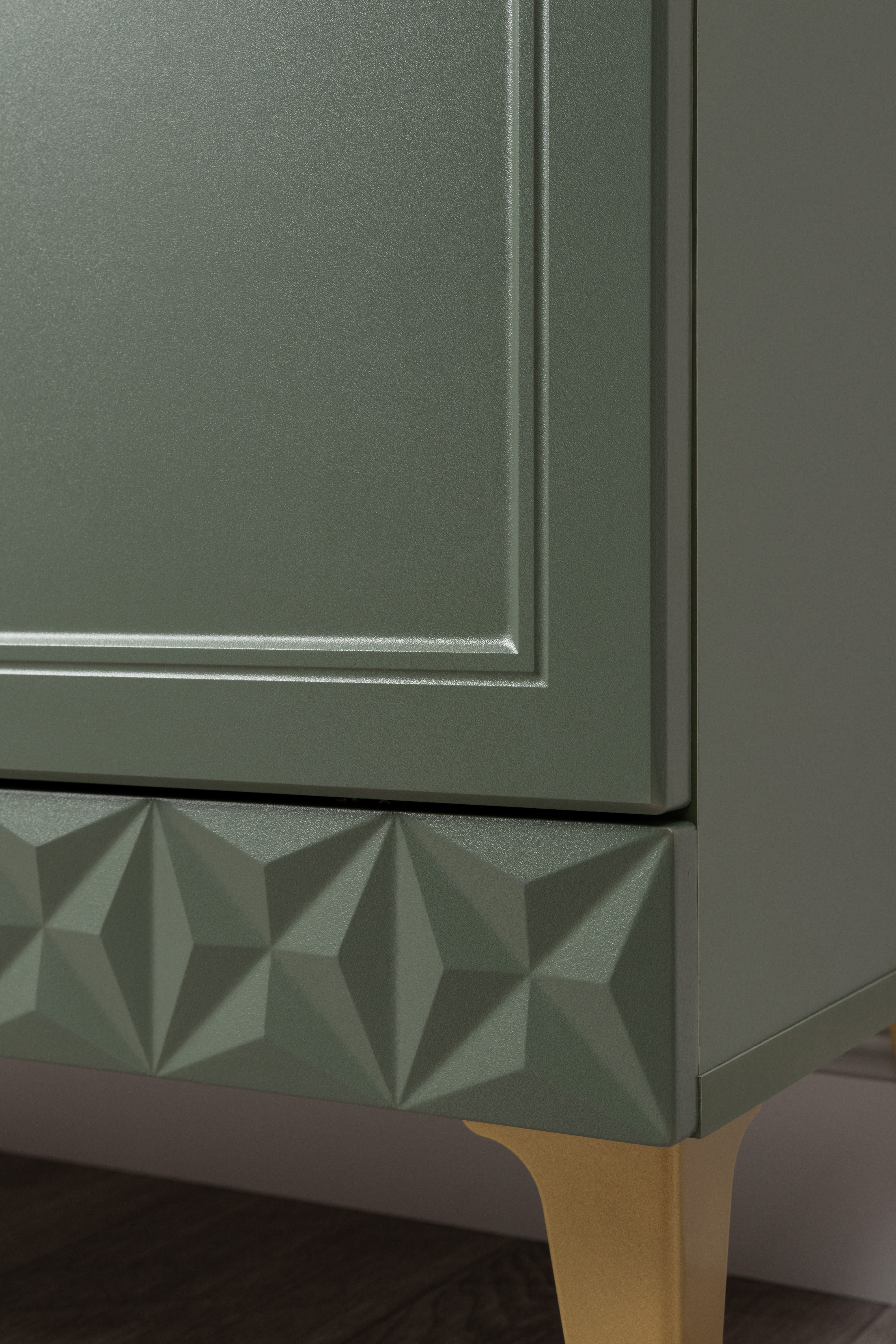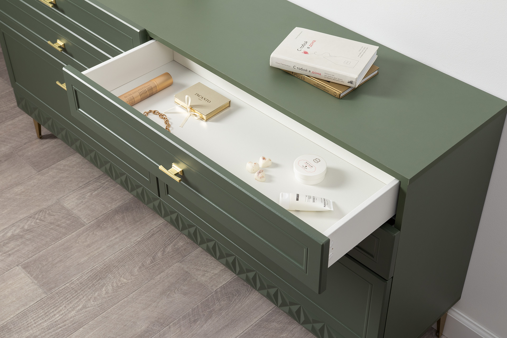Изящные линии, глубокая фрезеровка фасадов из МДФ и благородные оттенки. Утончённая «Слоновая кость» и изысканная «Олива Шагрень» с глубоким зелёным тоном — создают атмосферу уюта, тепла и благородства. Металлические ручки и опоры золотого цвета придают мебели утончённый блеск, а петли и направляющие с доводчиками обеспечивают плавное и бесшумное закрытие фасадов.