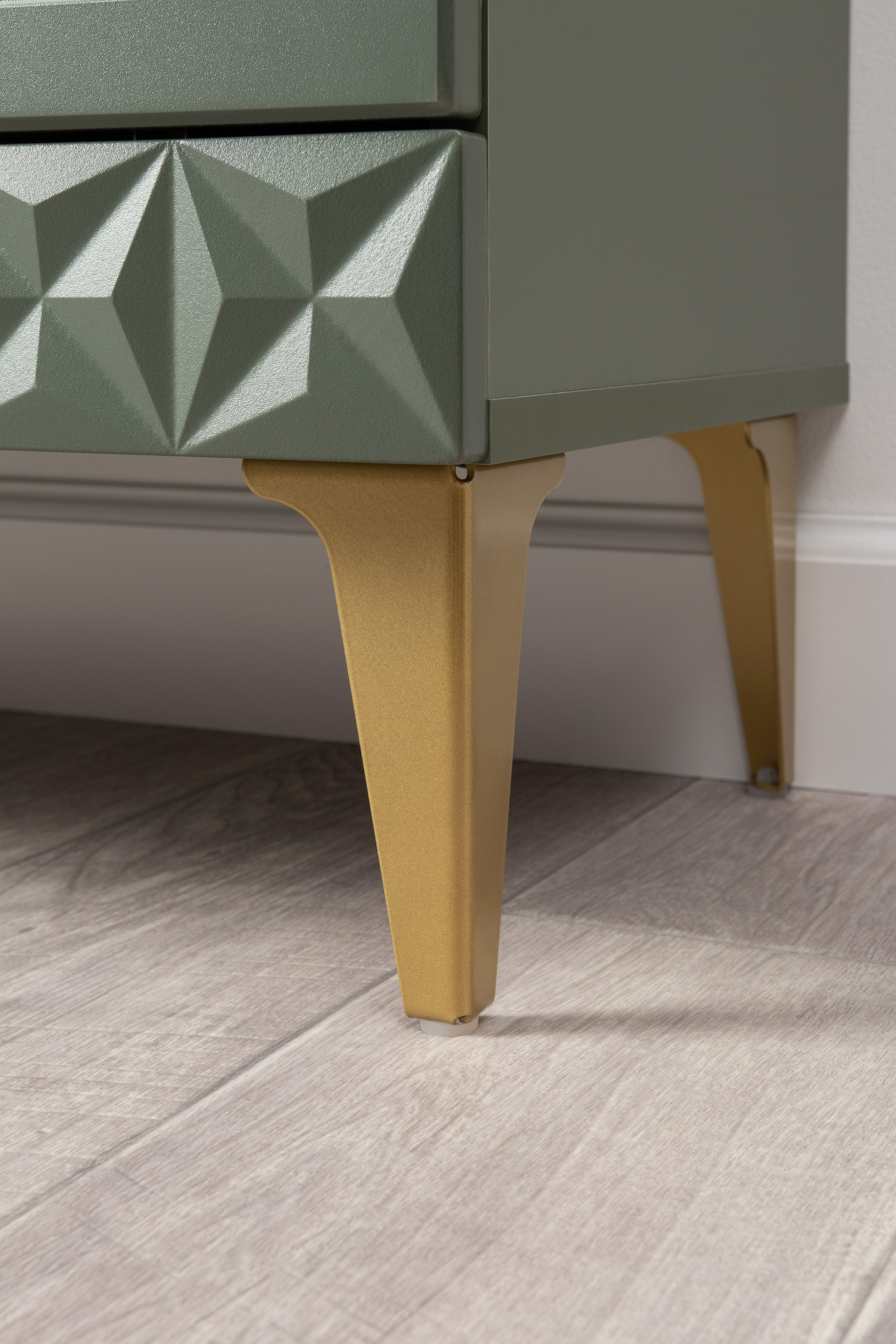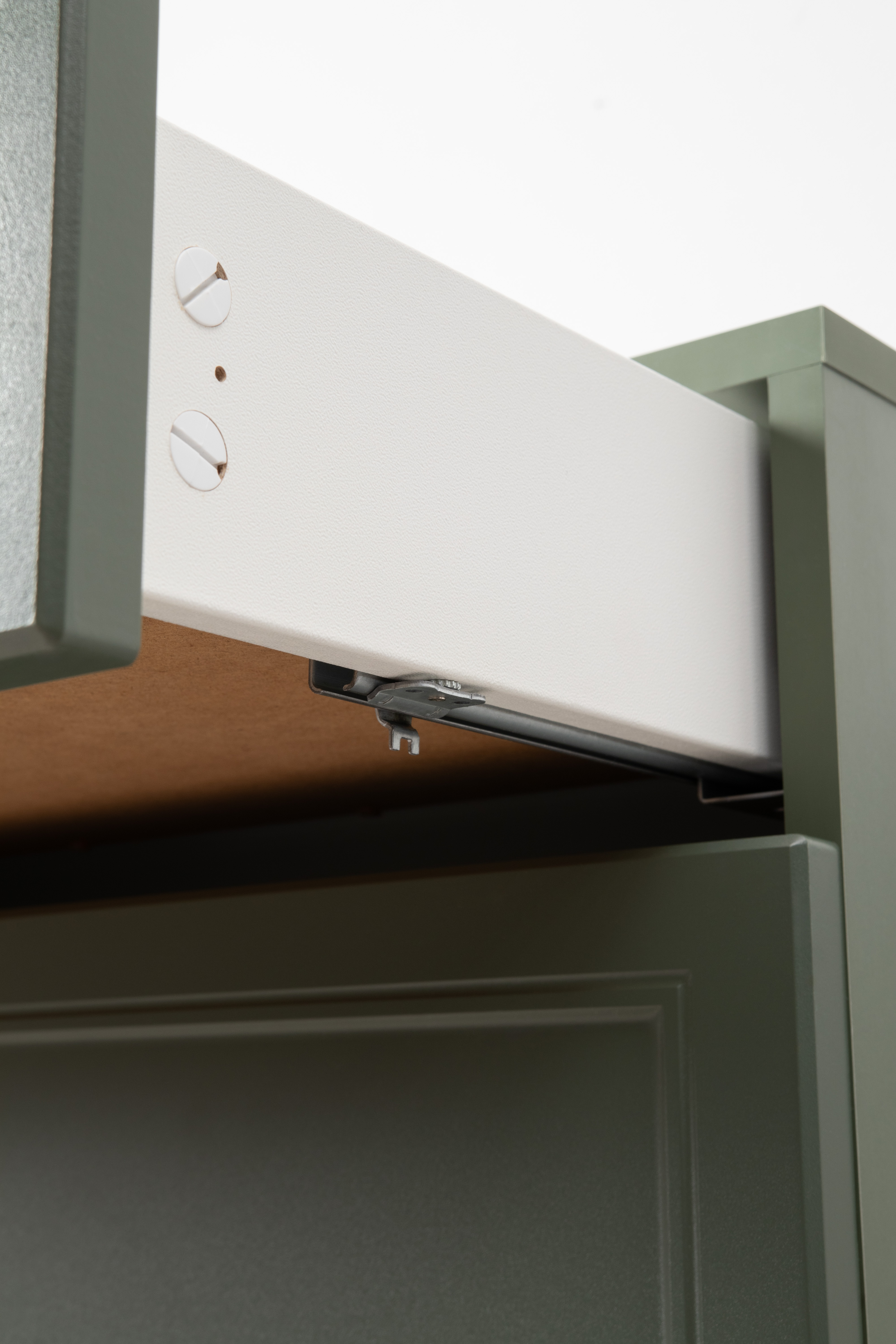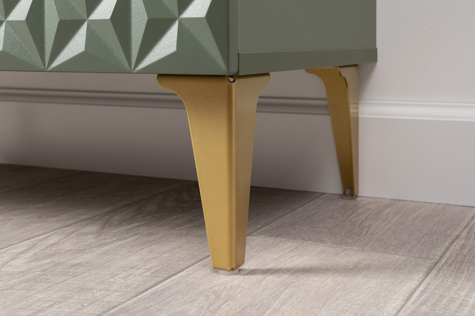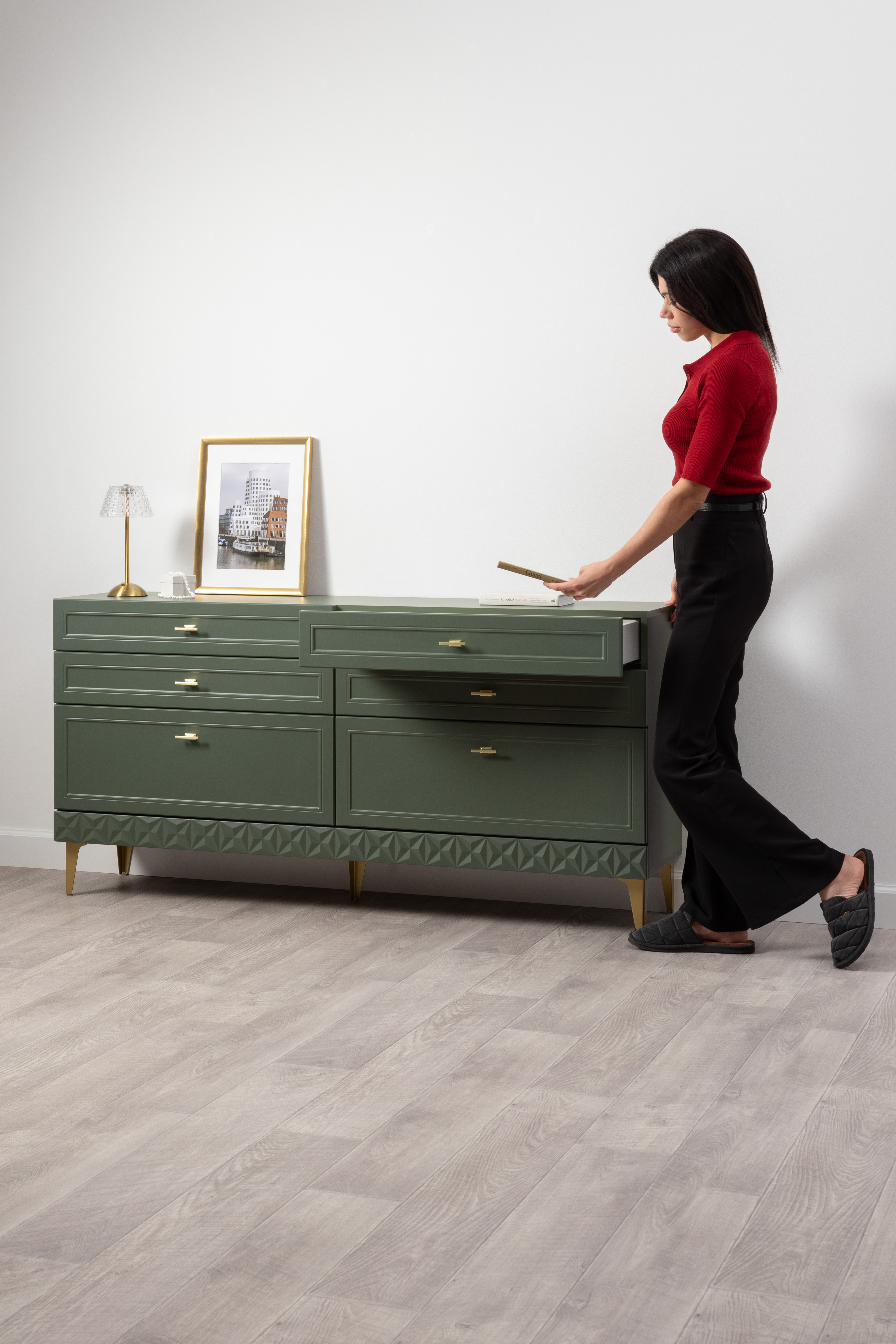 Изящные линии, глубокая фрезеровка фасадов из МДФ и благородные оттенки. Утончённая «Слоновая кость» и изысканная «Олива Шагрень» с глубоким зелёным тоном — создают атмосферу уюта, тепла и благородства. Металлические ручки и опоры золотого цвета придают мебели утончённый блеск, а петли и направляющие с доводчиками обеспечивают плавное и бесшумное закрытие фасадов.