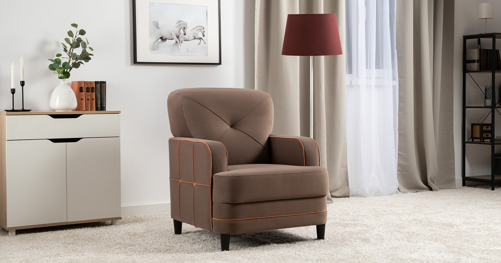 Декоративные канты на вставке подлокотников. Пуговицы в местах пересечения кантов на подушке и вставке подлокотников. По торцам подлокотников и думках контрастный декоративный кант. Защипы на сиденье и подушке.