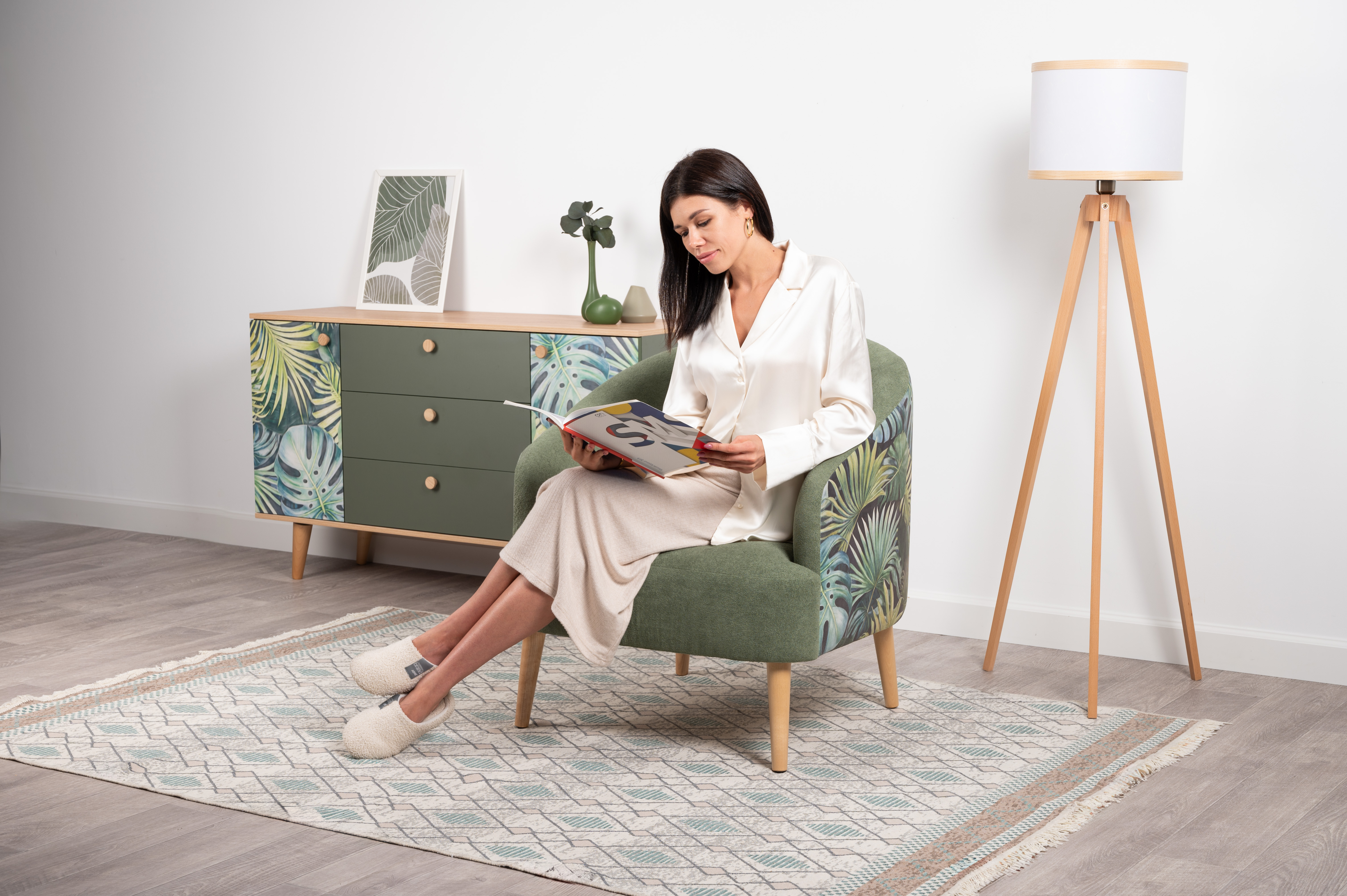 Маттиас — оригинальное кресло готовое стать акцентом в интерьере. Яркий тропический принт «монстера» на спинке мгновенно сделает комнату живой и современной.