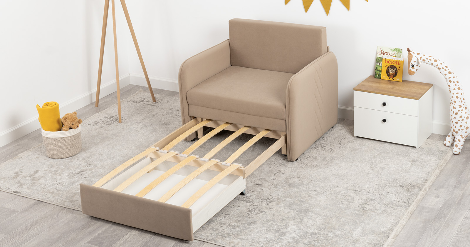 Стильный компактный диван для детской и гостиной. При своих скромных размерах он трансформируется в полноценное спальное место для детей и подростков. Лаконичный дизайн в виде декоративной стежки подчеркивает фактуру велюра, а небольшие размеры позволят разместить его в любом пространстве.