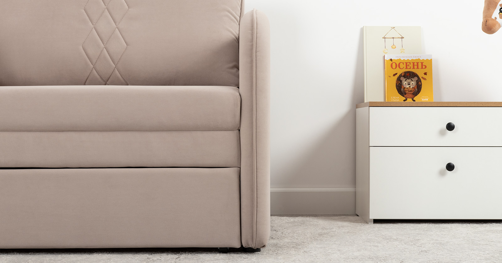 Стильный компактный диван для детской и гостиной. При своих скромных размерах он трансформируется в полноценное спальное место для детей и подростков. Лаконичный дизайн в виде декоративной стежки подчеркивает фактуру велюра, а небольшие размеры позволят разместить его в любом пространстве.