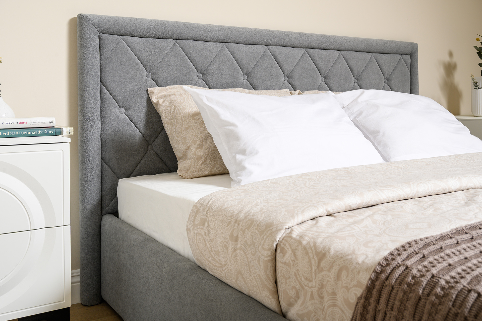 Кровать Марион — это идеальное сочетание стиля и комфорта. Элегантное изголовье оформлено стежкой в виде классической каретной стяжки, украшенной декоративными пуговицами, что придаёт изделию выразительный и утончённый вид. По всему периметру кровати проходит аккуратный валик, подчеркивающий геометрию и завершённость формы.