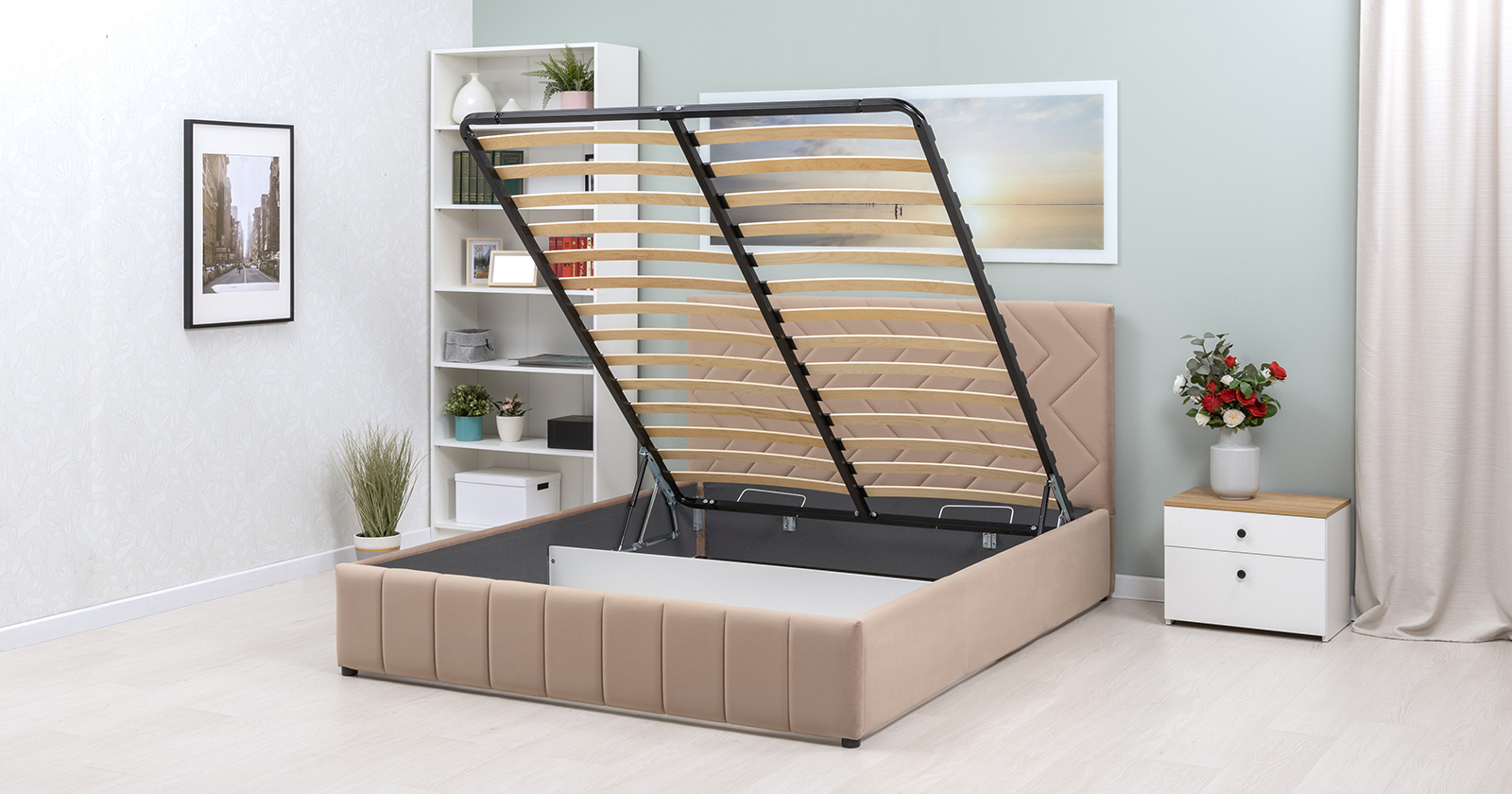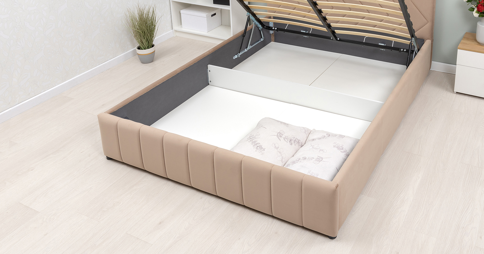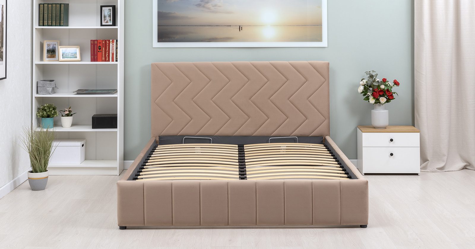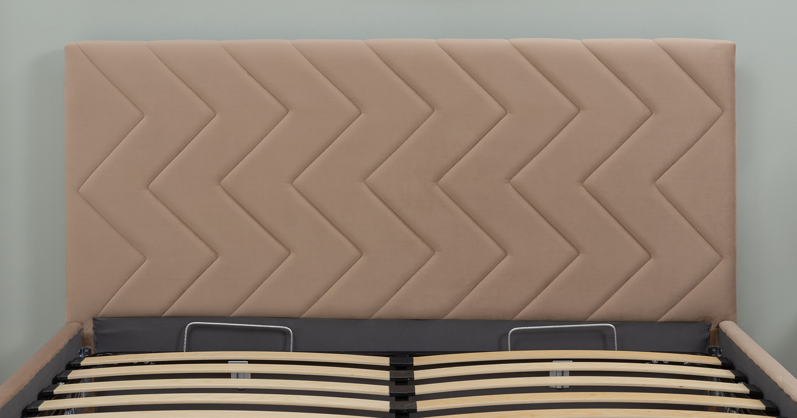 Кровать Милана 180 велюр бежевый кофейный с ортопедическим основанием и подъемным механизмом