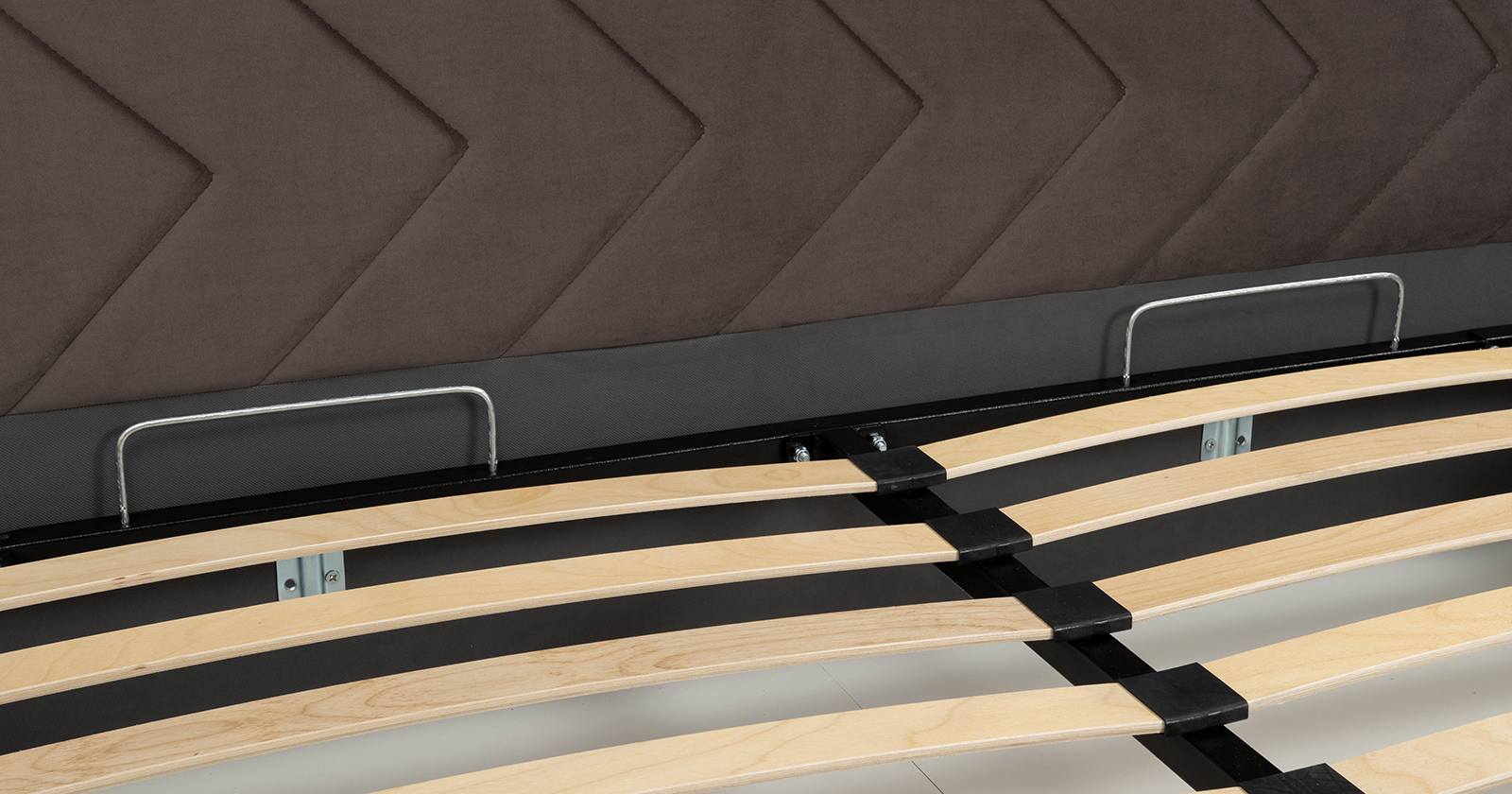 Основание кровати укомплектовано матрасодержателями. Жесткое кроватное дно из ЛДСП 16 мм. Задняя стенка изголовья выполнена в тех. ткани (спанбонд).