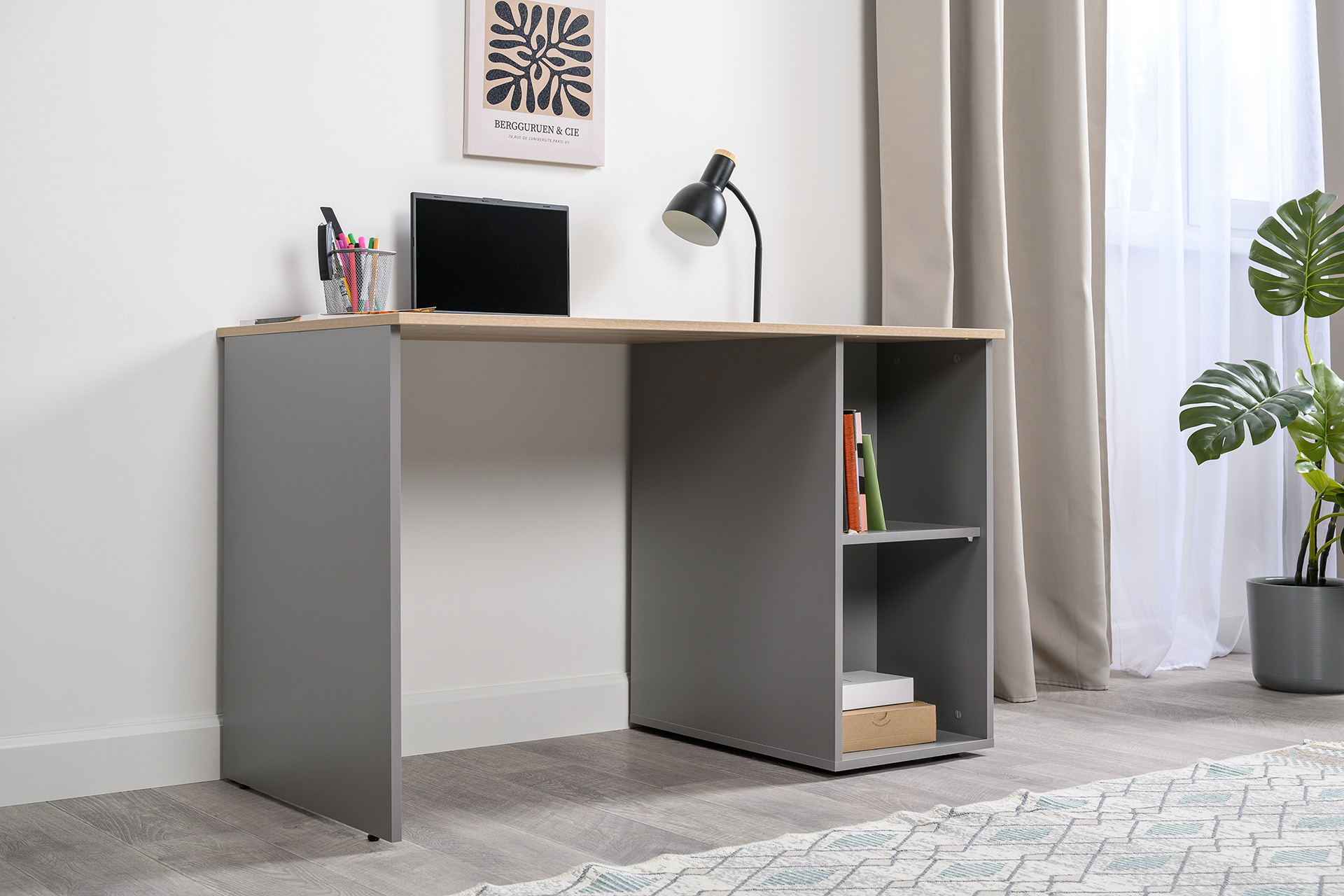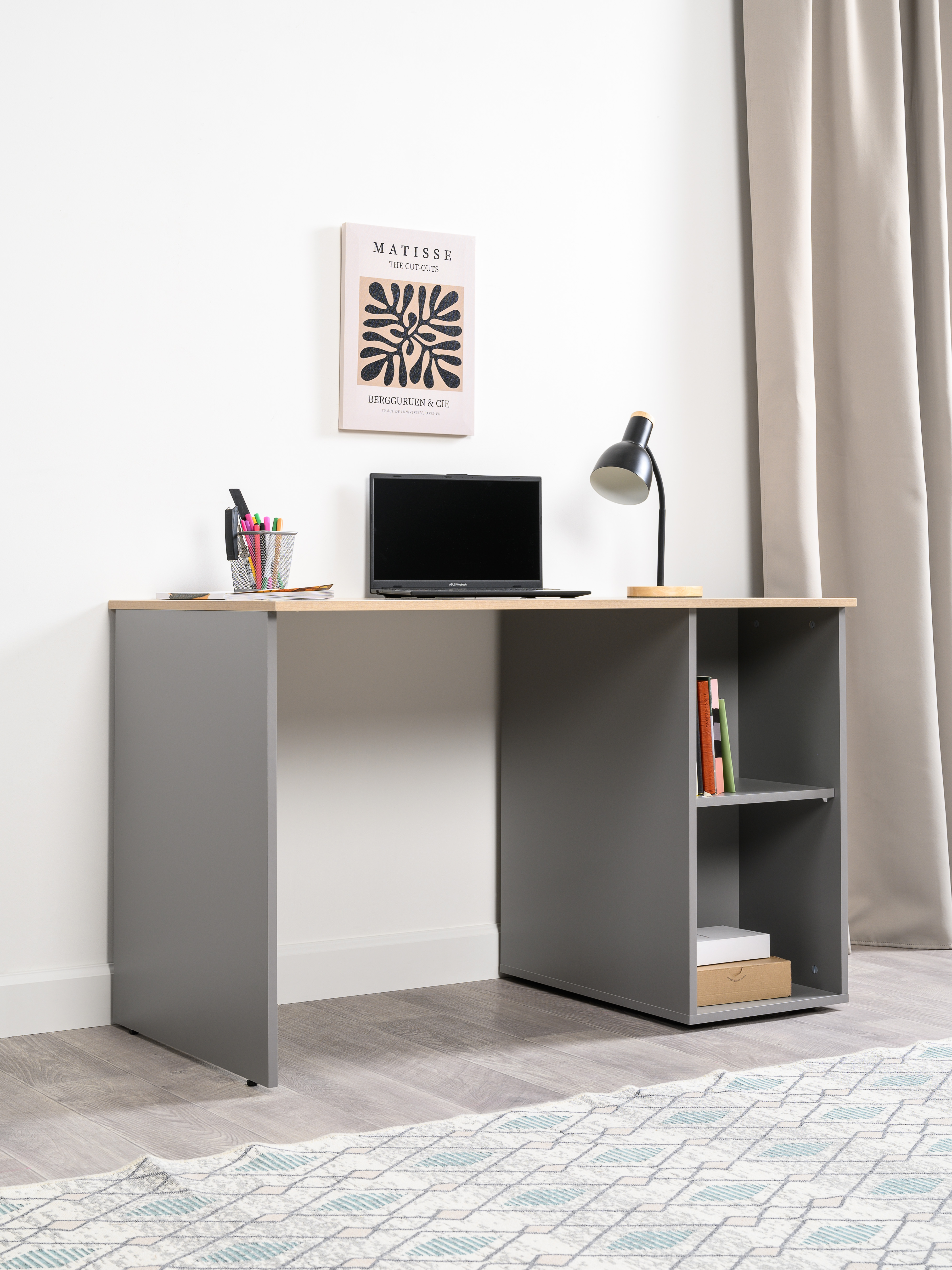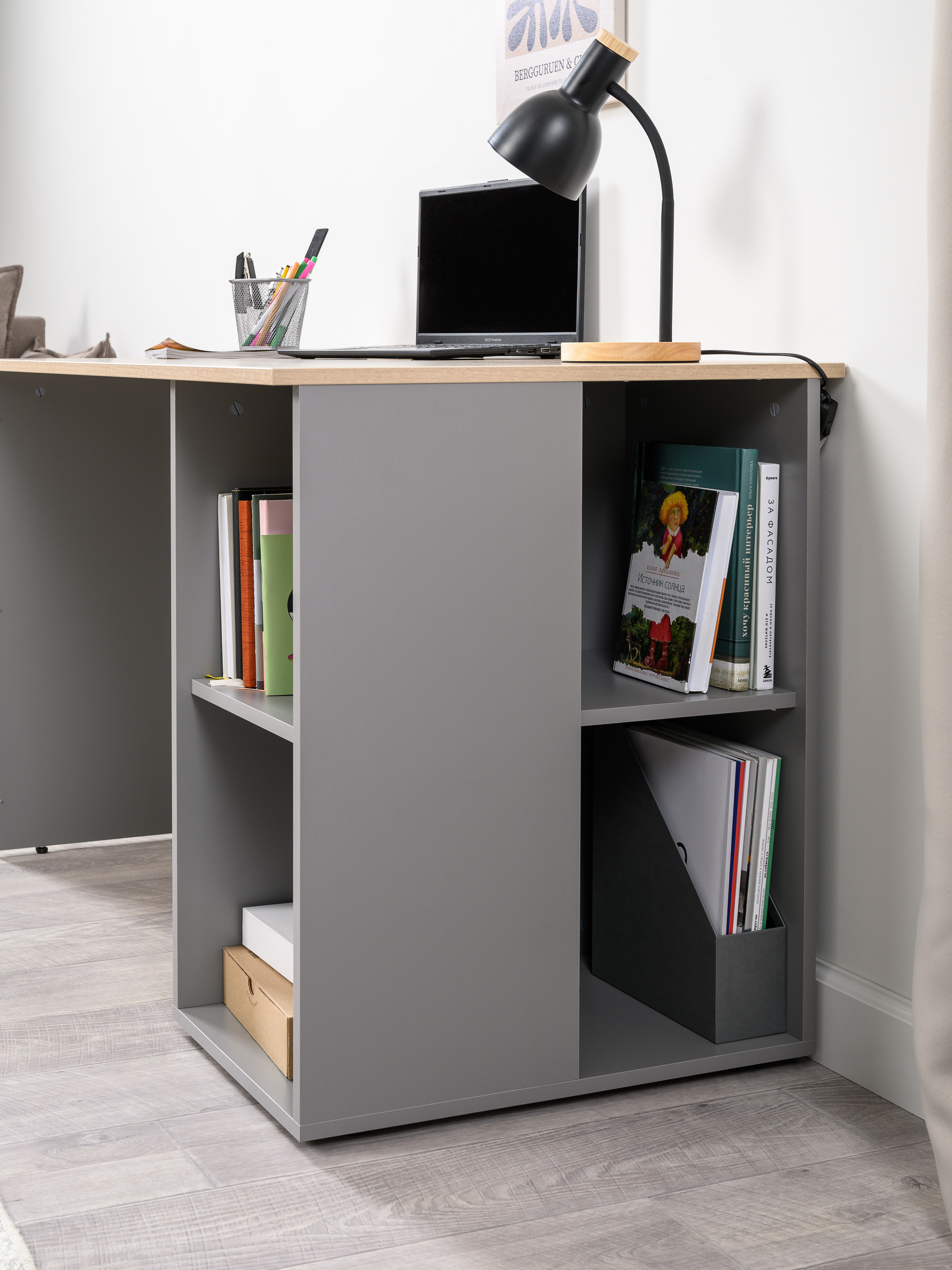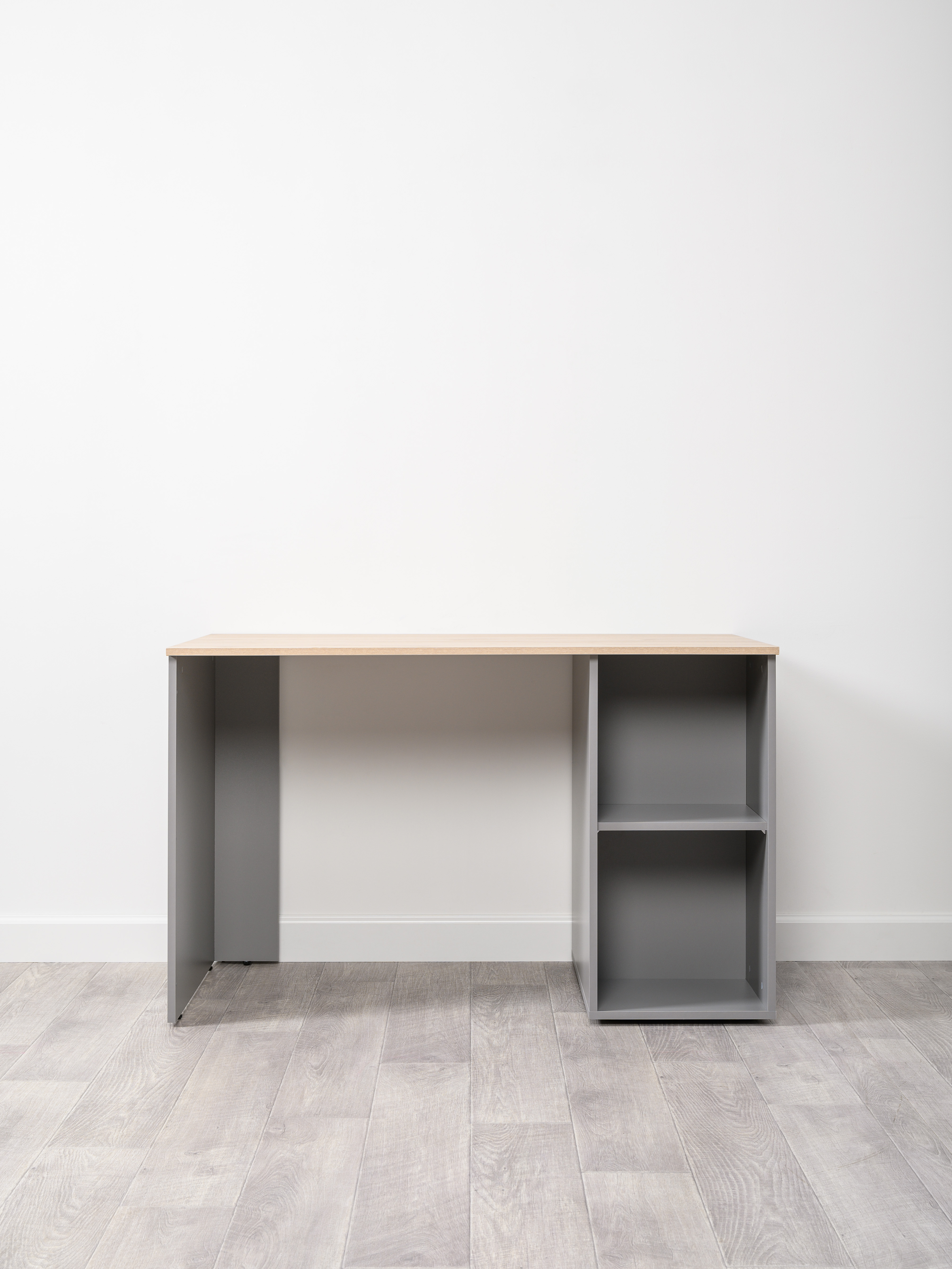 Стол письменный Лайт 12.163 серый шифер, дуб белый exclusive OW D4430, сборка на любую сторону, два варианта сборки тумбы