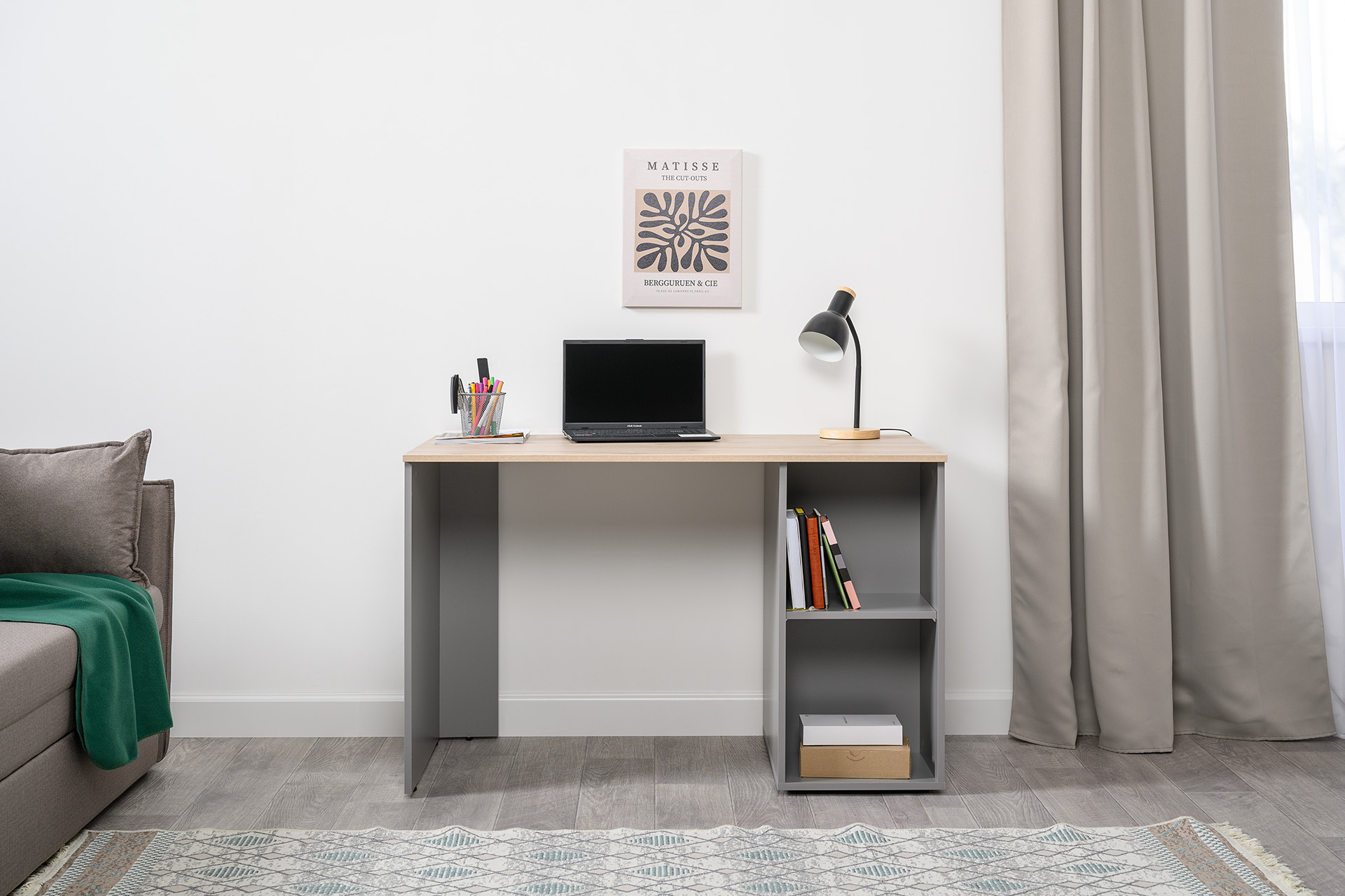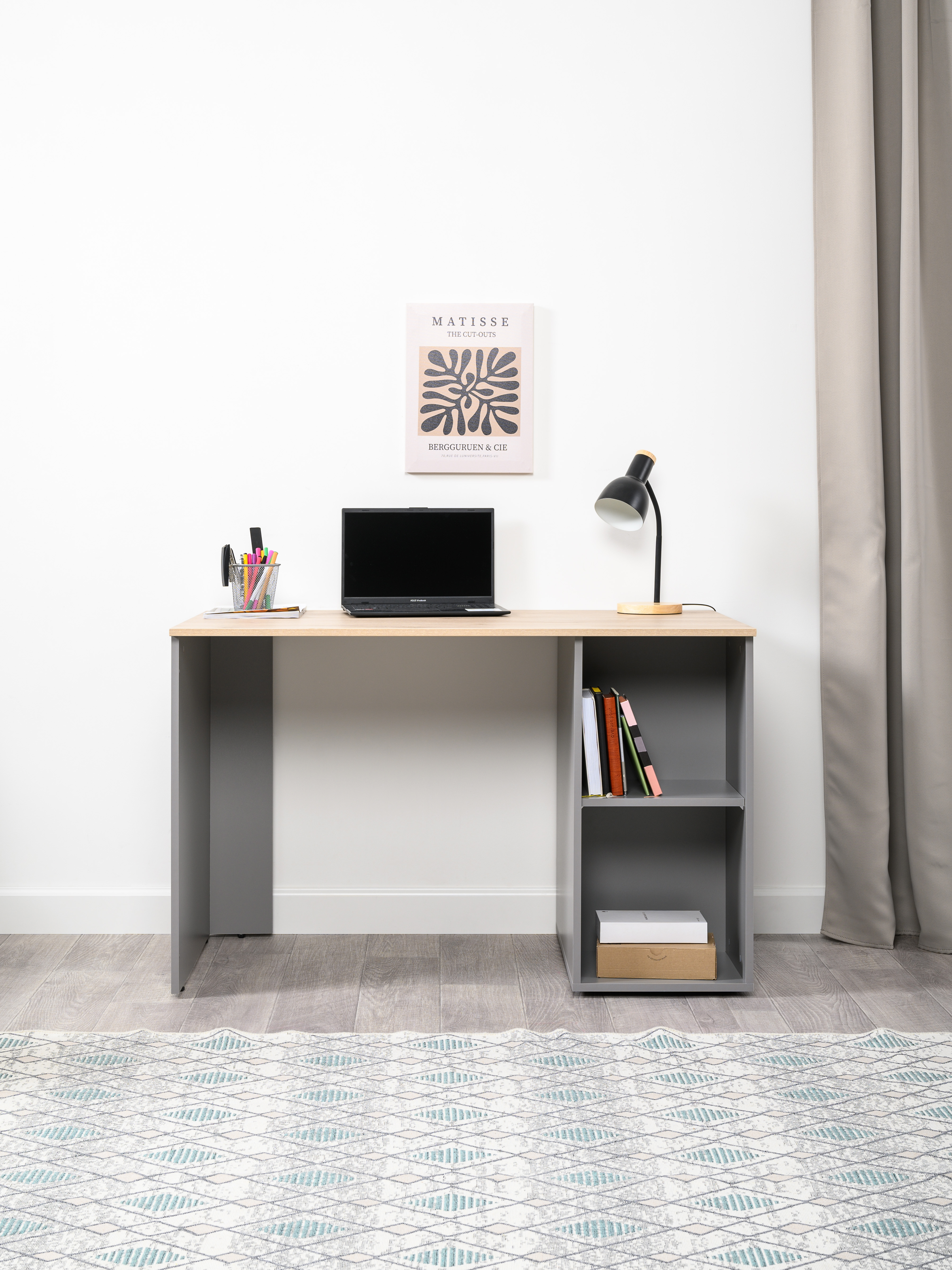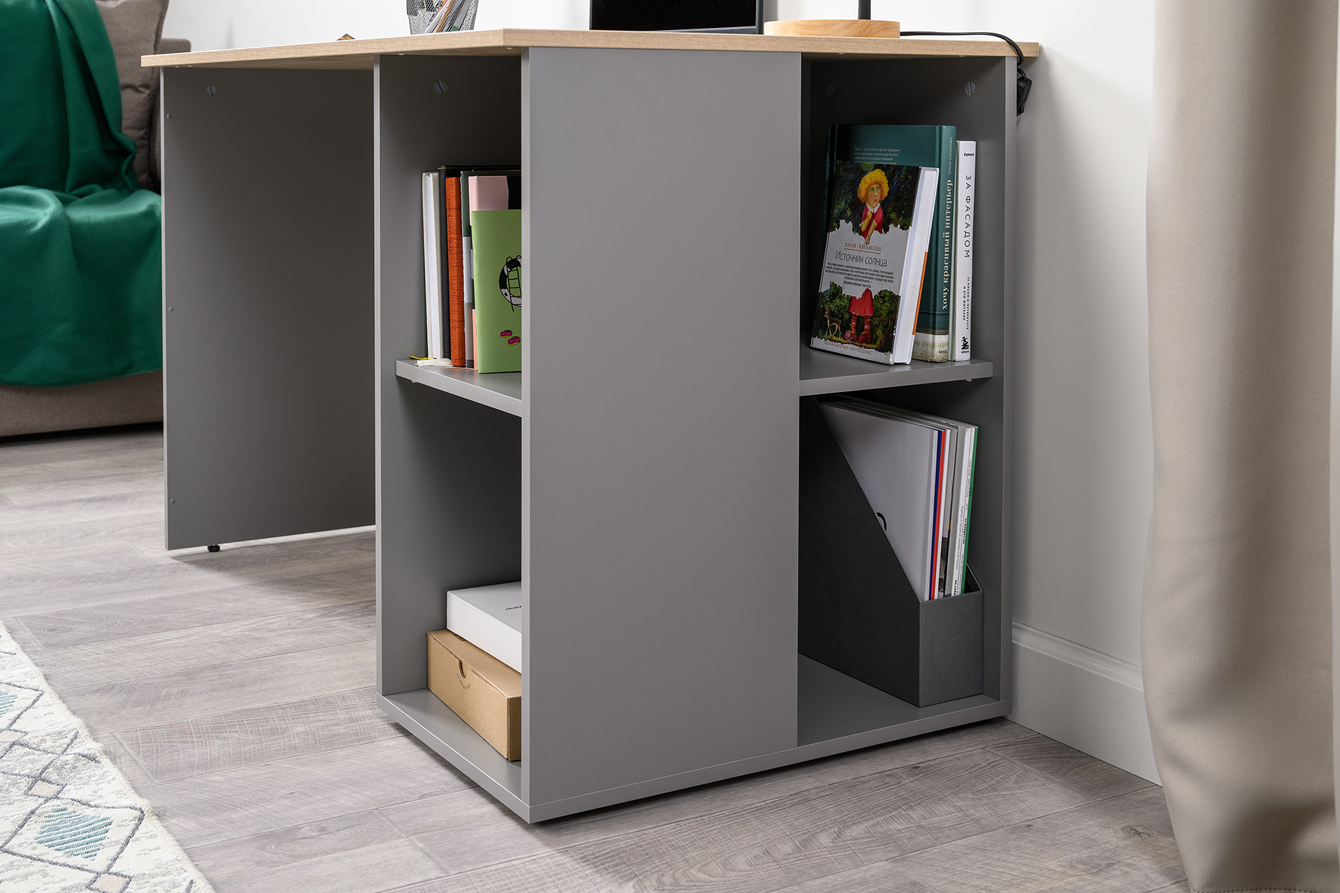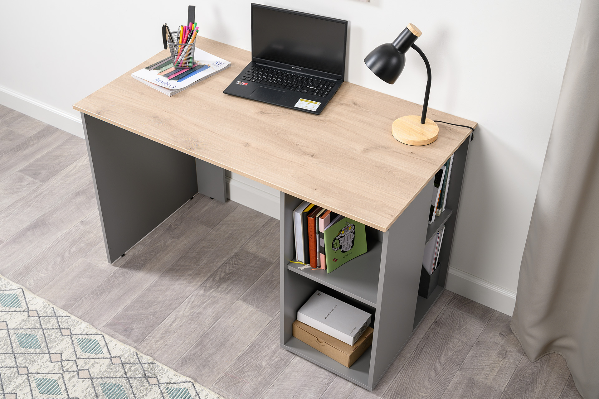 Стол письменный Лайт 12.163 серый шифер, дуб белый exclusive OW D4430, сборка на любую сторону, два варианта сборки тумбы