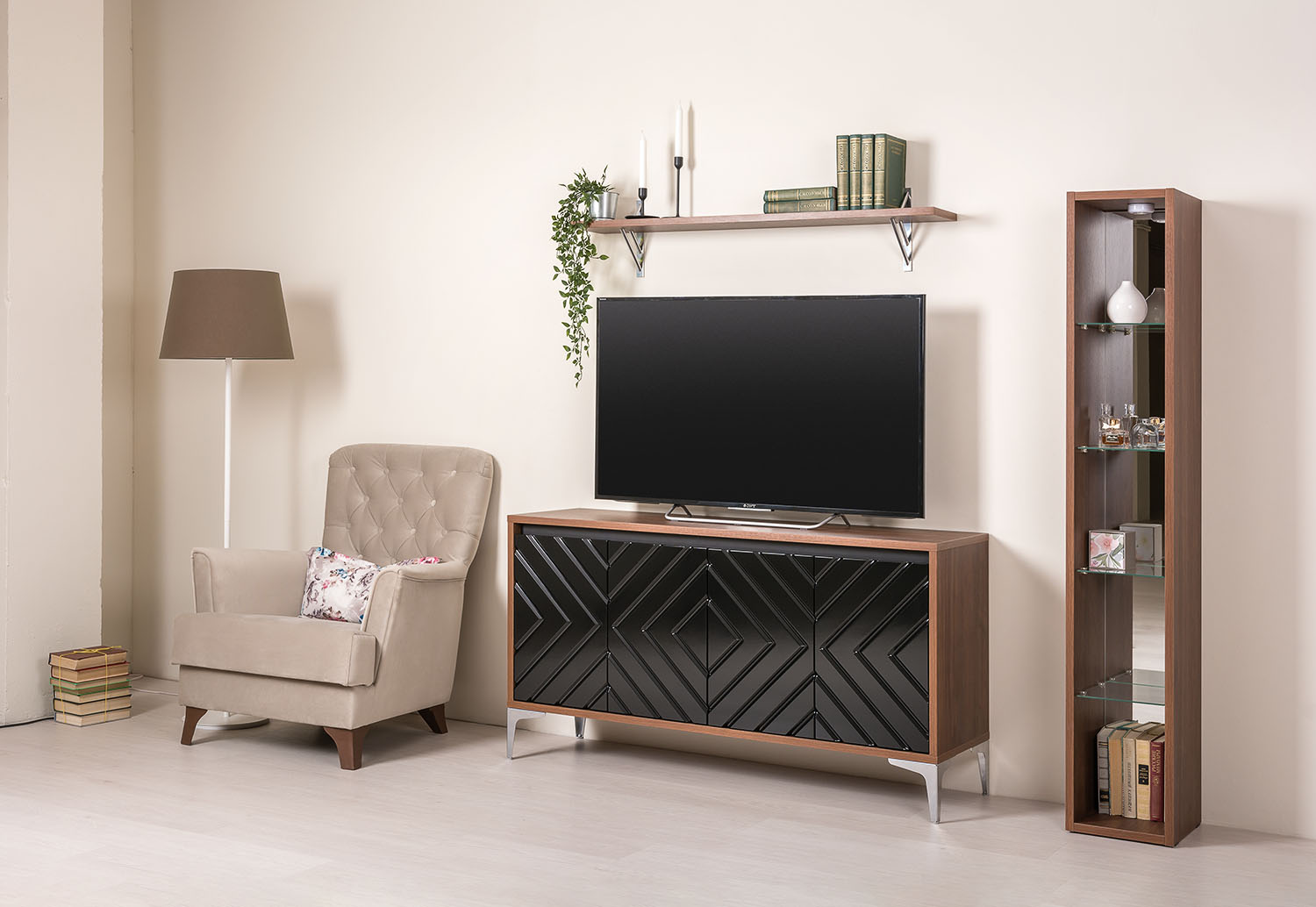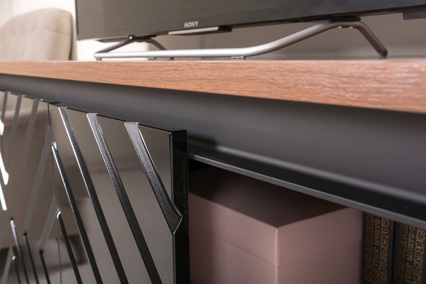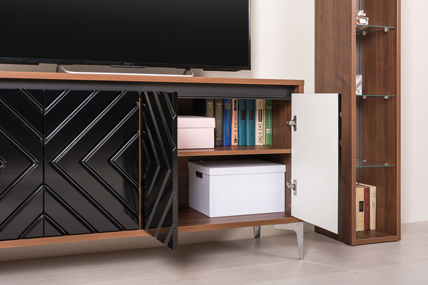 Тумба под ТВ в гостиную Муар 13.262 орех селект каминный, черный глянец ПВХ